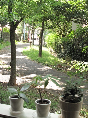 ベランダに出てグリーンを日光浴させてたら、家の前の遊歩道の景色にうっとり。